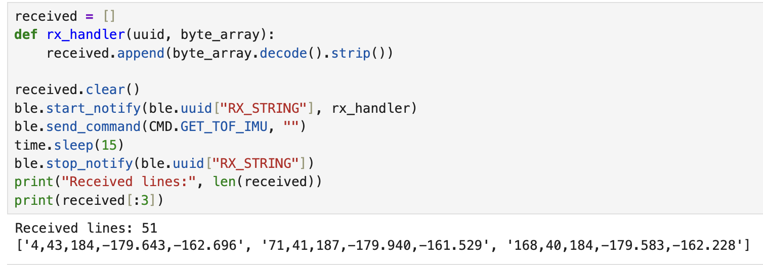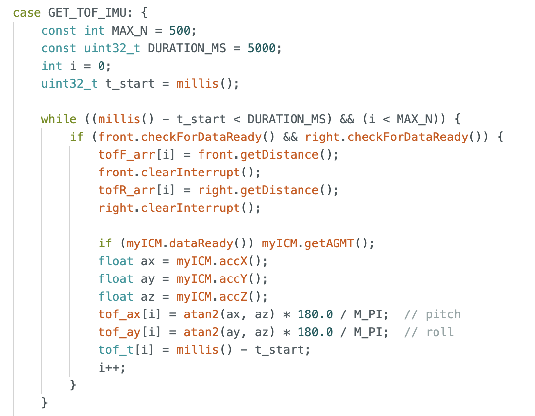 I created a new command to read data from both the IMU and ToF simultaneously, and then transferred the data to my computer via Bluetooth. Below is the main code on my Arduino side.
