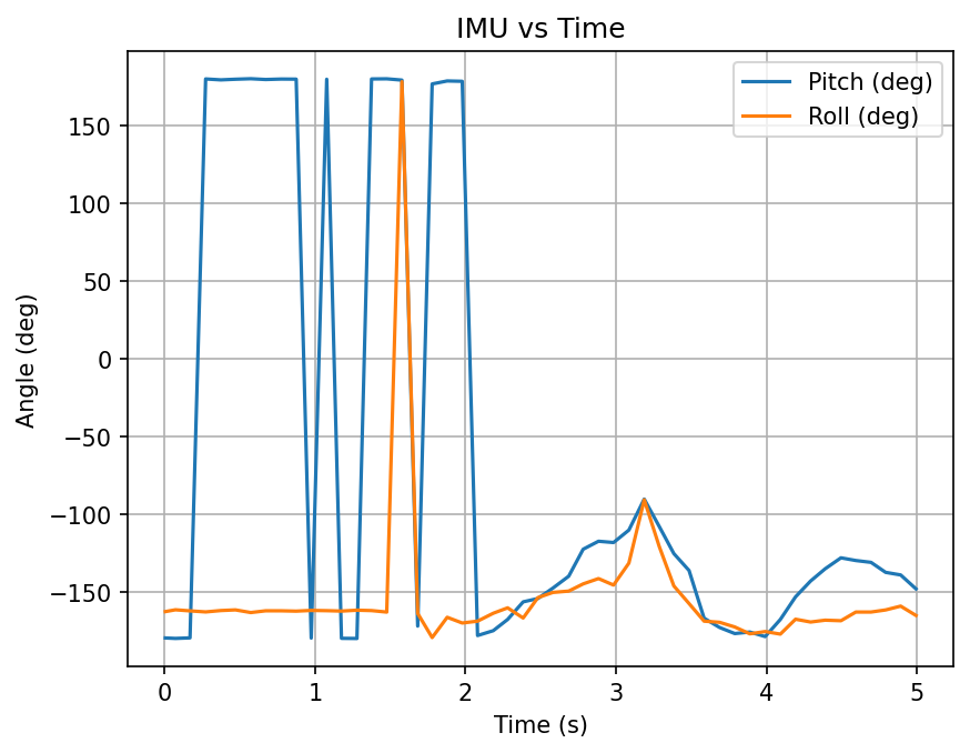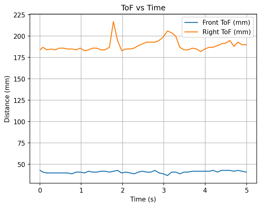 Below is the data I received from Jupyter. Each time, I can receive five data points: from beginning to end, time, distances measured by the two TOFs, and the IMU pitch and roll.