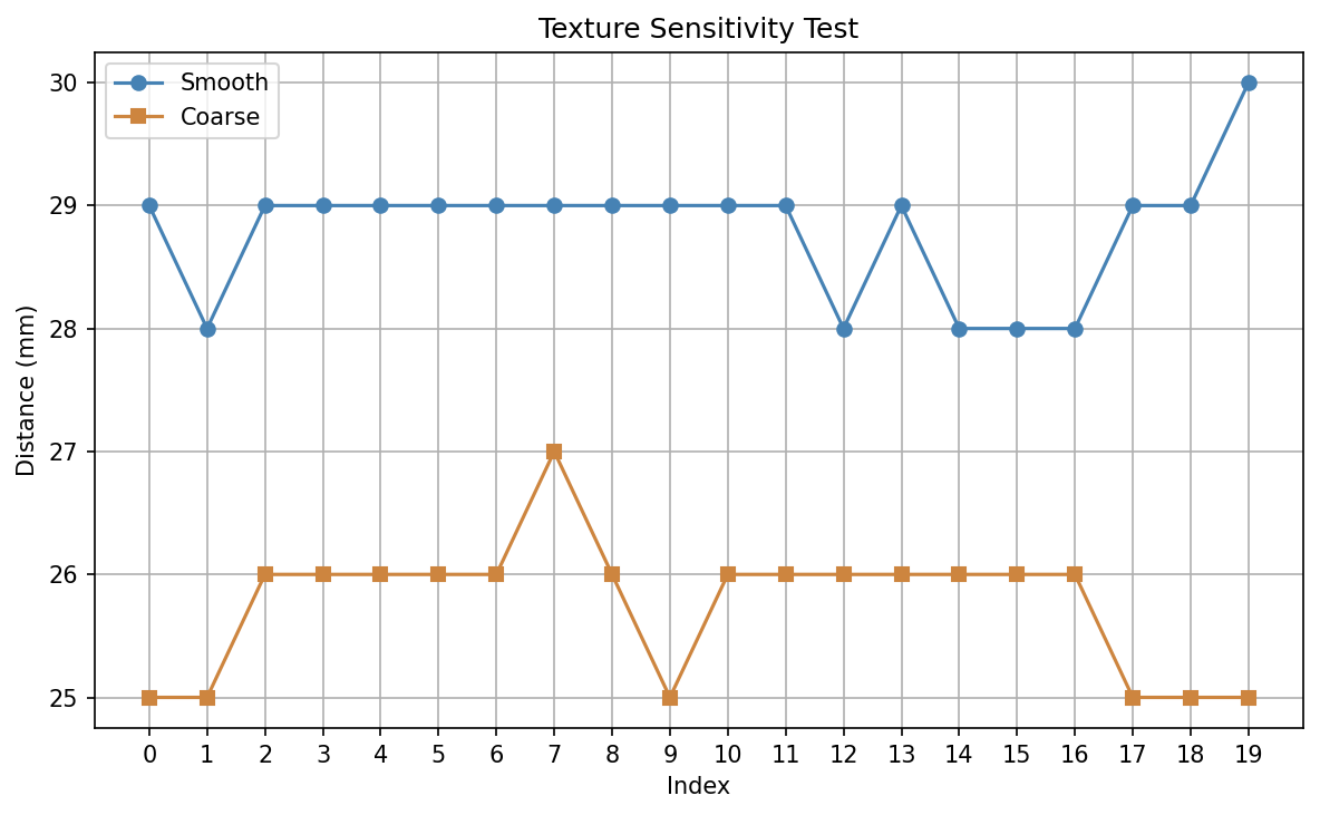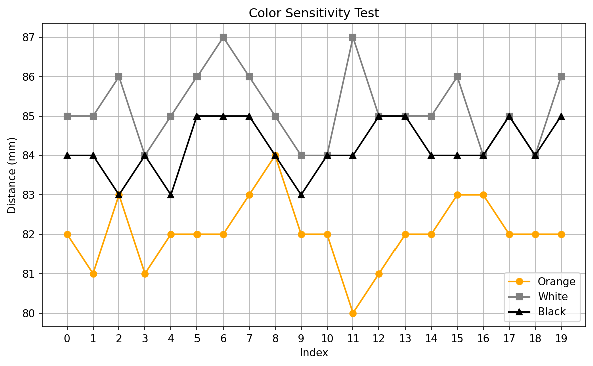 For color, I used three colors—orange, black, and white—at the same distance for ToF measurements. For texture, I used smooth white cardboard and a relatively rough towel. The measurement results are as follows. Due to the handheld sensor during the experiment, the results may not be entirely accurate, but they still demonstrate that ToF is quite robust to color and texture.