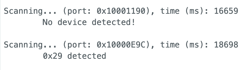 I ran the example file and got the following output. The output address is 0x29, which does not match the expected 0x52 in Prelab. This is because the least significant bit of the 8-bit address in I2C is the read/write bit, while the Arduino library uses a 7-bit address. The original 0x52 is shifted one bit to the right to get 0x29.