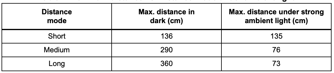 The ToF sensor has three modes: short, medium, and long. This is a screenshot I took from the ToF datasheet.