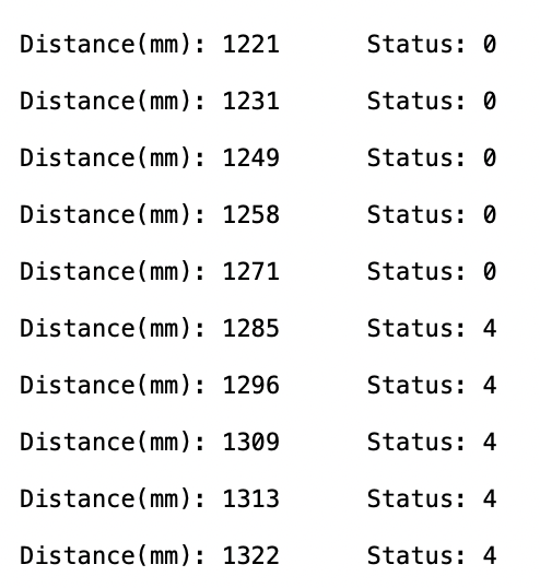 I fixed the Time-of-Flight (ToF) sensor and moved it from near to far towards the wall, calling the getRangeStatus function to record the sensor's status. The results are shown below, indicating that the sensor's status started to malfunction at a distance of 1270mm, which is consistent with the datasheet's maximum range of approximately 1.3 meters in short mode.