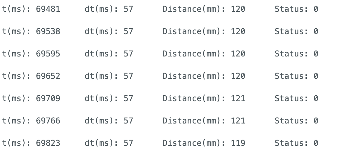 I calculated the sensor's ranging time by extracting the interval between two data outputs. The result showed that the interval between the two measurements was 57ms, which corresponds to a frequency of 17.5Hz.