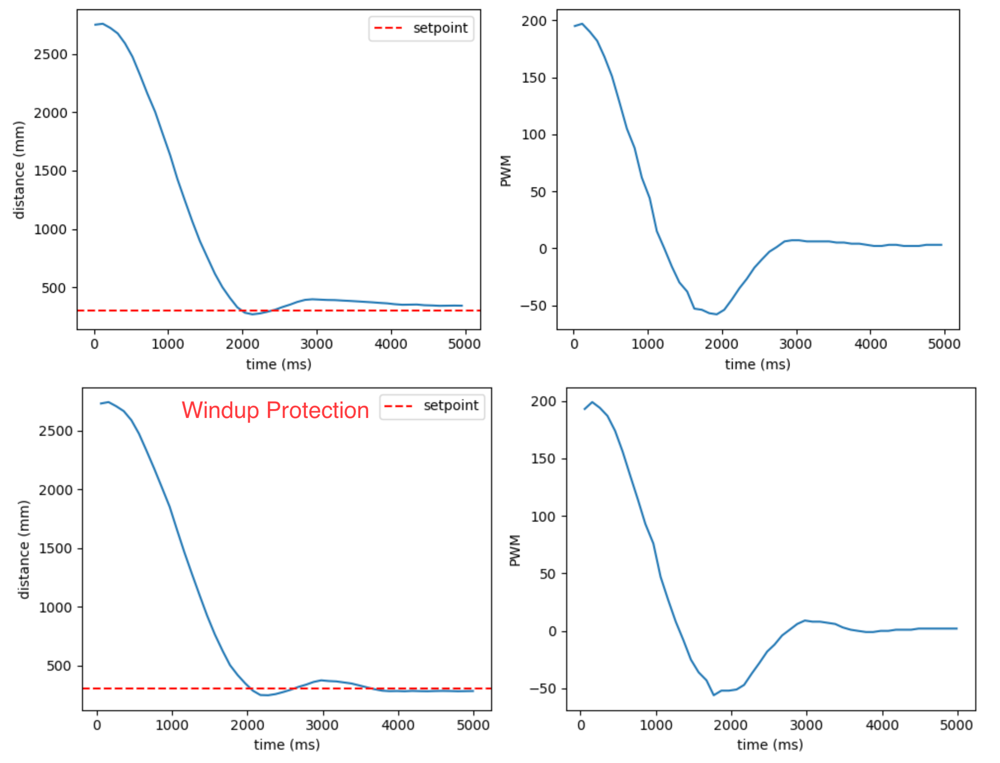 The image below shows a comparison with and without Wind-up protection, demonstrating that with protection added, the robot can get closer to the set point.