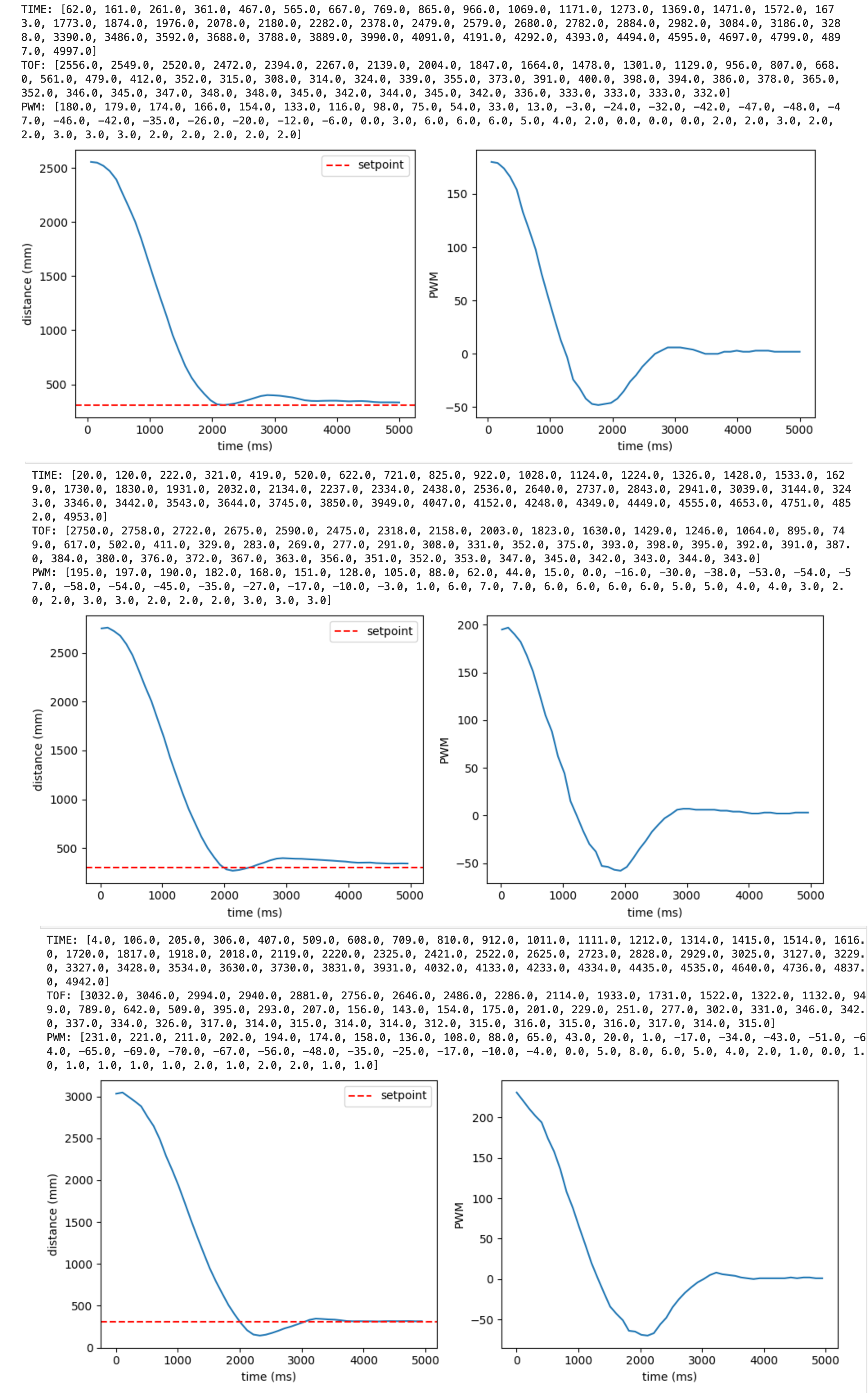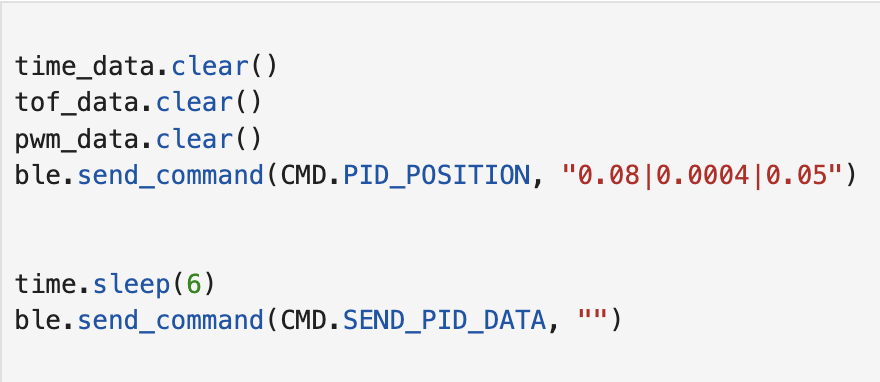 Two BLE commands were implemented: one to start the PID run with specified gains, and one to stream the stored data back. On the Jupyter side, a notification handler parses the incoming comma-separated strings into time, ToF, and PWM arrays for plotting.
