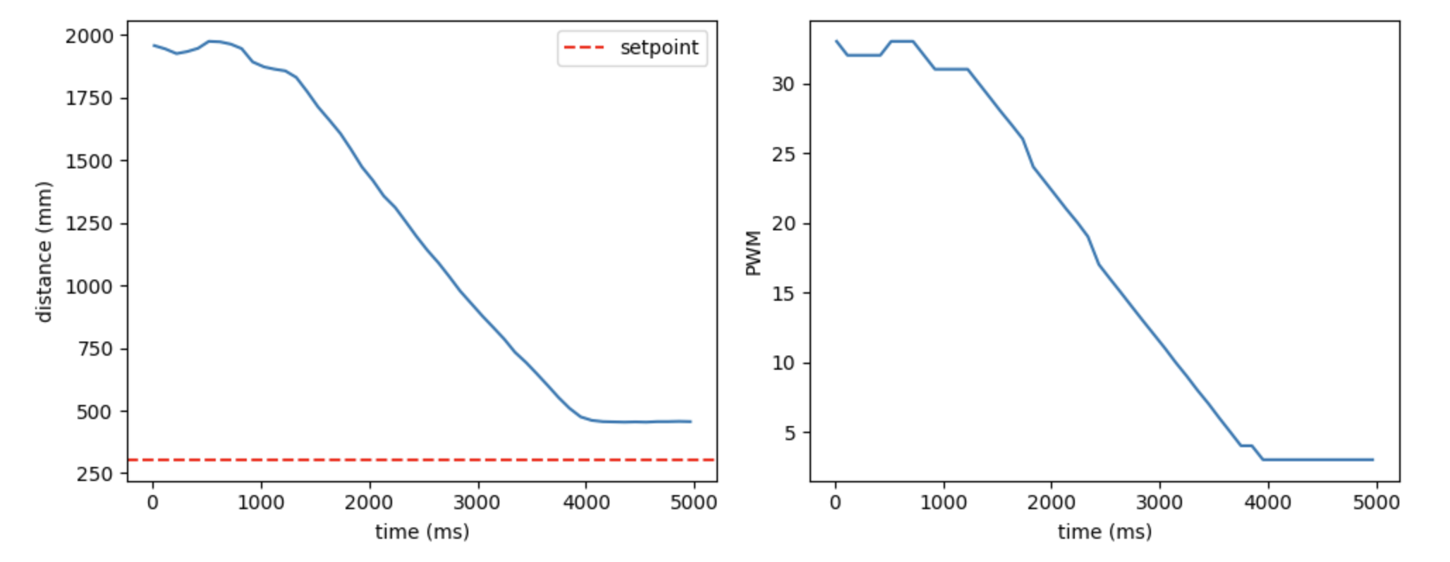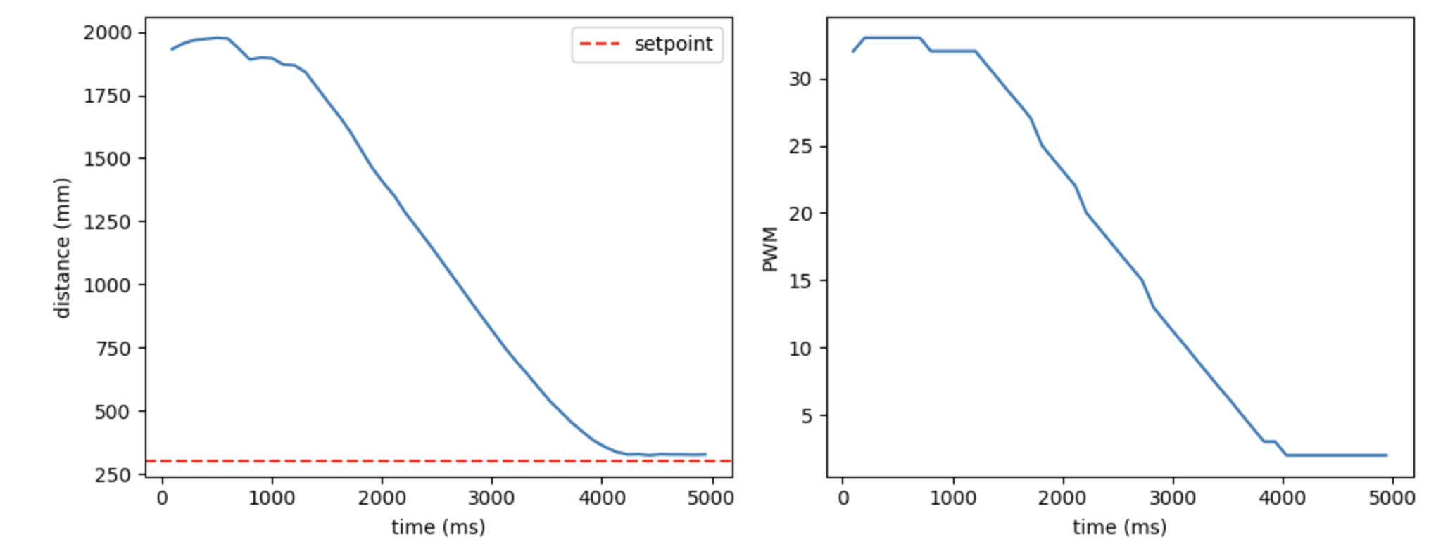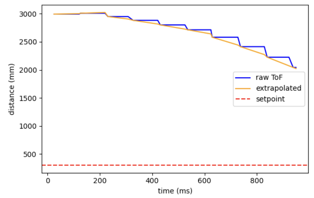 Below is the result graph after the run. As you can see, the extrapolated values (orange) smoothly fill the gaps between the original ToF step sizes (blue), allowing the PID controller to obtain distance estimates more frequently without waiting for new sensor data.