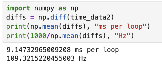 In lab3, the time-of-flight (TOF) data transmission frequency was measured to be approximately 17.5 Hz. I calculated the PID loop frequency to be approximately 109 Hz, about six times that of TOF, significantly faster than TOF.