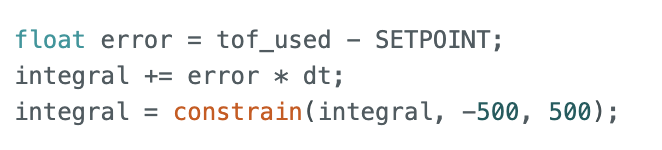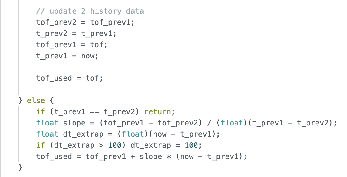 To decouple these two rates, a linear extrapolation method was used: when no new TOF data is available, the current distance is estimated using the slope between the two most recent TOF readings. Below is the code I used to implement linear extrapolation. To prevent the estimated value from going too far as the extrapolation time is too long, if there is no new ToF data after more than 100ms, the extrapolation will stop.